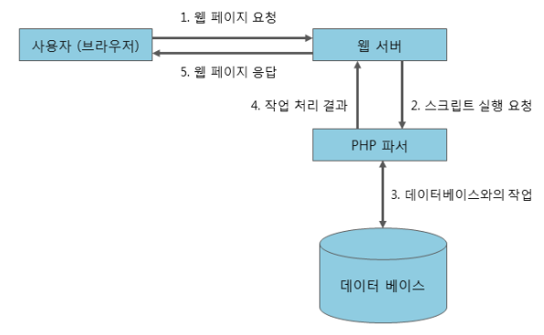 ② : 웹 서버는 클라이언트가 요청한 웹 페이지의 로직 및 데이터베이스와의 연동을 위해 PHP 파서(parser)에 이에 대한 처리를 요청