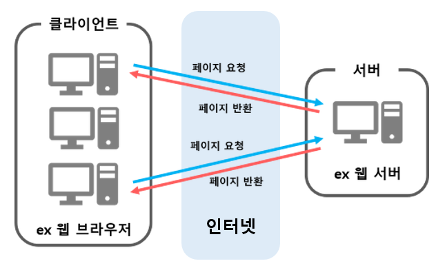 - 클라이언트(client) : 서버가 제공하는 웹 서비스를 이용하는 사용자 또는 사용자의 기기(브라우저)를 의미