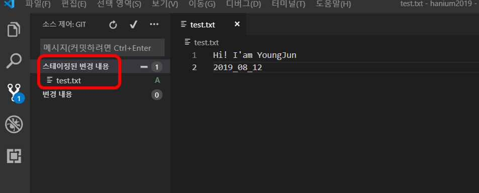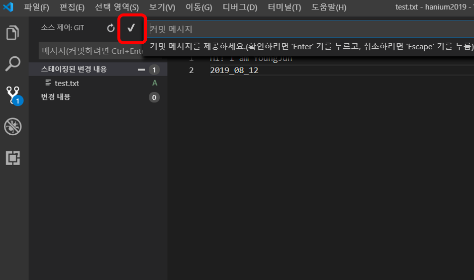 소스제어 아이콘에 1 이 표시되는 것을 확인할 수 있습니다.