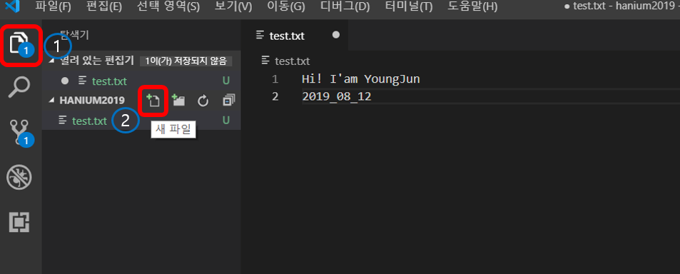 test.txt 파일을 생성하고 아래 그림처럼 좌측 메뉴의 탐색기 버틀을 누른 후 파일을 추가하면